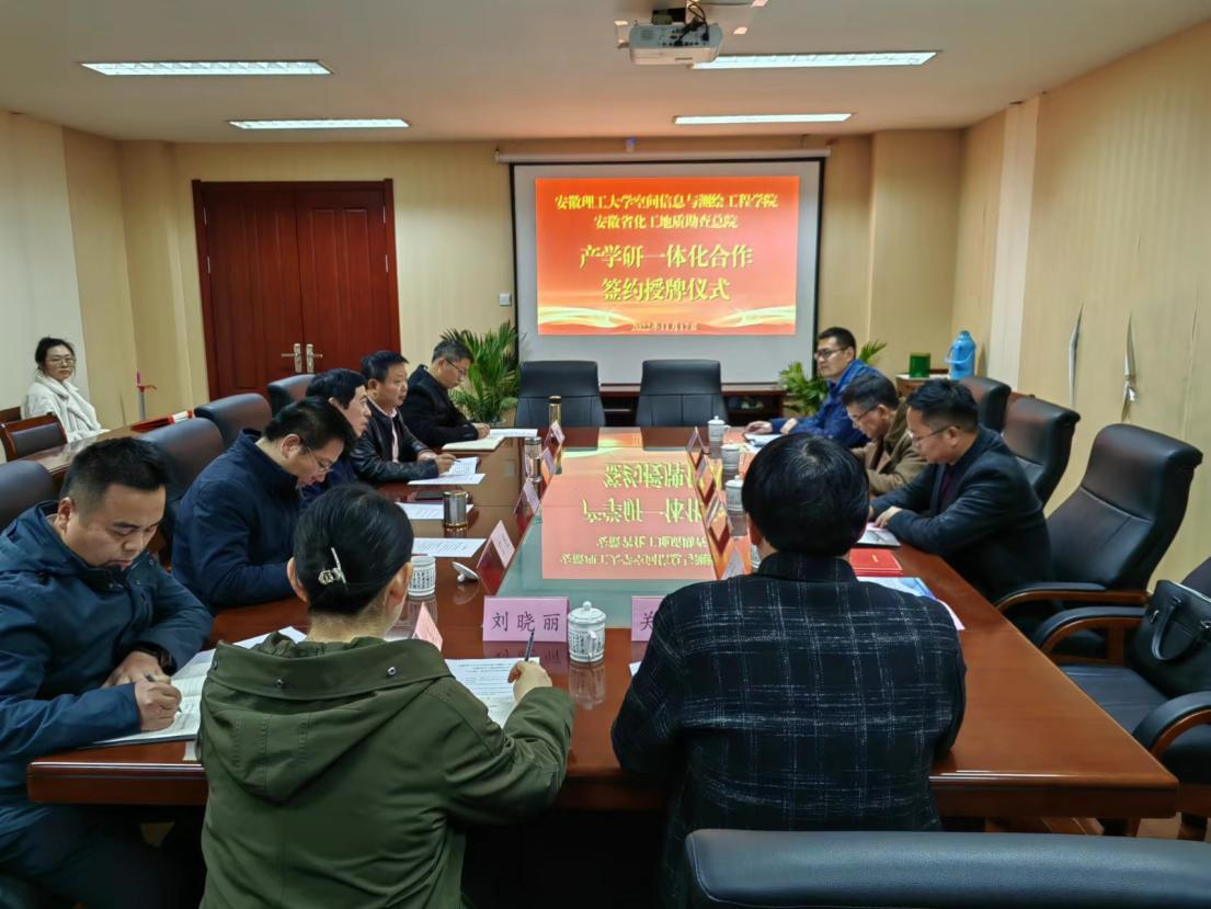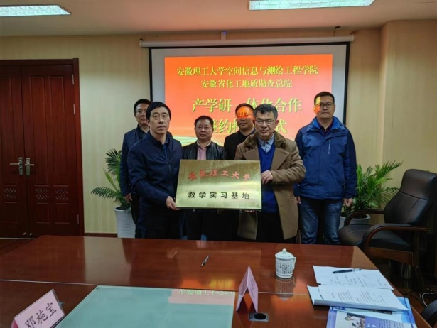 11月17日,威尼斯9499登录入口院长余学祥教授、副院长赵兴旺教授、副院长王磊教授和导航工程系主任方新建一行4人赴安徽省化工地质勘查总院举行了共建研究生实践基地与本科生教学实习基地合作协议签约授牌仪式。安徽省化工地质勘查总院党委书记、院长杨成荣,纪委书记、副院长张博,党委委员、自然资源调查监测分院院长言龙,党委委员、安徽化工地质工程勘察院有限公司常务副总经理邓施宝,党委委员、党政办主任杨玉军,人事科副科长刘晓丽,自然资源调查监测分院副院长关烨等参加了签约仪式。签约仪式由杨成荣主持。