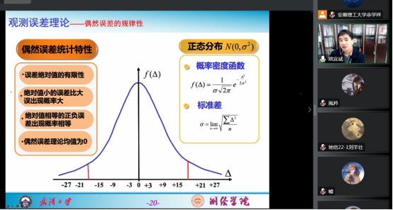 姚教授首先提出了测量数据处理的3大科学任务,然后从同学们日常生活中熟悉的角度测量、长度测量、高差测量等测量基本工作中出现的测不准问题,引出测量误差的基本概念,从误差的来源、产生的原因、误差分类、误差处理基本方法、衡量精度的指标等方面进行详细讲解,并举例解释了在本科阶段常用的最小二乘估计基本原理。授课内容丰富充实、深入浅出、图文并茂,并通过动画演示加深了同学们对讲授内容的理解。